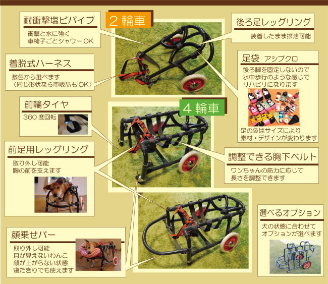4輪車はハーネス・前足用レッグリング・顔乗せバーで